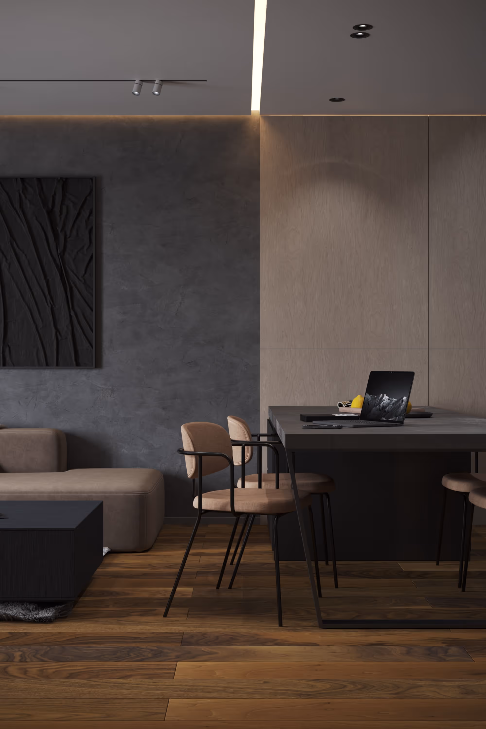 Проект интерьера квартиры для молодого человека в центре Таллина на площади 60 кв.м. сочетает эстетику минимализма и элегантность тёмных оттенков. Основная задача — создать пространство, отвечающее современным требованиям к стилю и функциональности, учитывая любовь заказчика к глубоким графитовым оттенкам и эффекту полутонов.