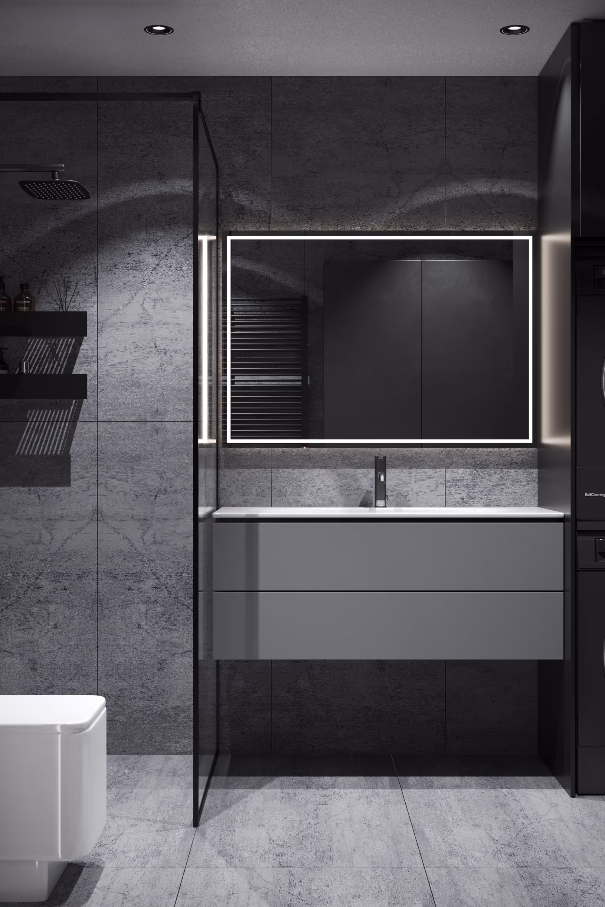 Ключевую роль в интерьере играет мебель, спроектированная на заказ. Я продумал все элементы с учётом личных предпочтений заказчика: мебель выполнена в тёмной цветовой гамме, сочетающей графитовые и матовые текстуры. Вместительные системы хранения созданы так, чтобы они гармонично вписывались в общую концепцию, не загромождая пространство.